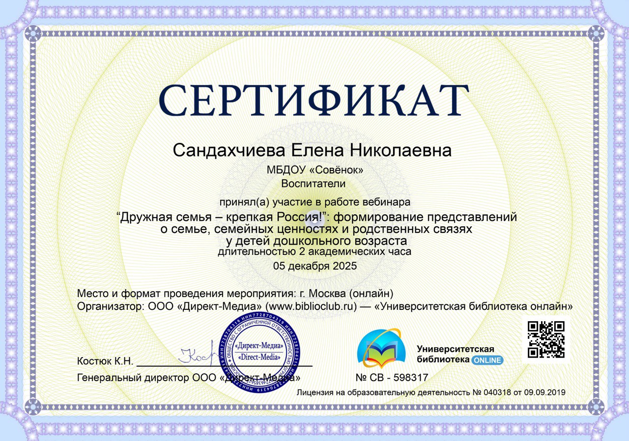 Сертификат участника вебинара "Дружная семья - крепкая Россия!" формирование представлений о семье, семейных ценностей и родственных связейу детей дошкольного возраста. 5 декабря 2025