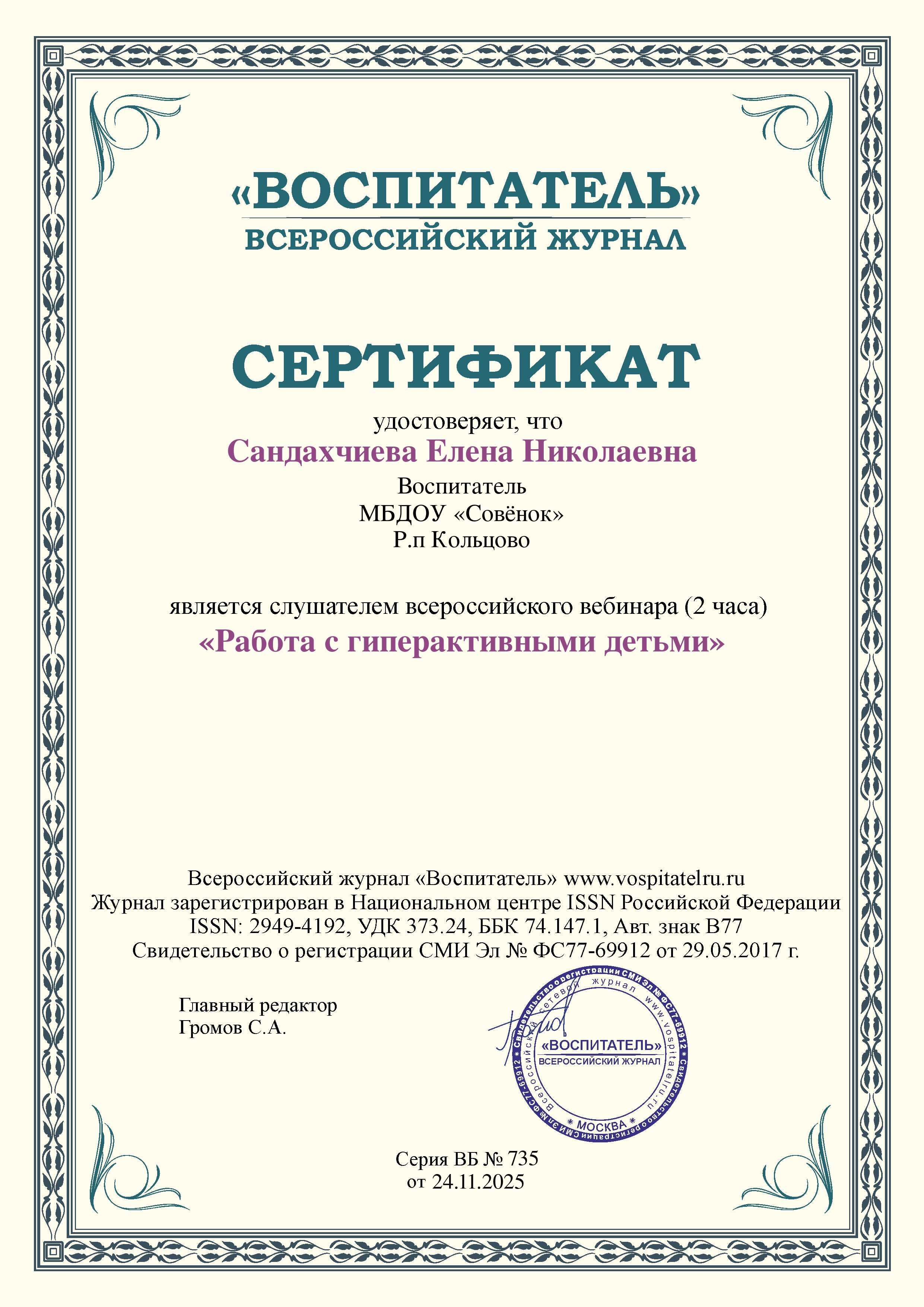 Сертификат участника вебинара "Работа с гиперактивными детьми" Ноябрь 2025