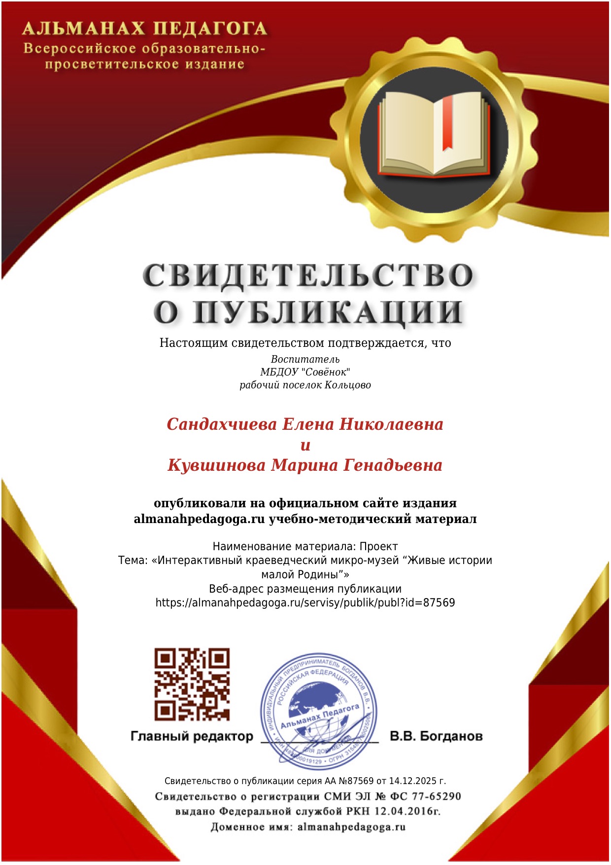 Свидетельство о публикации на официальном сайте Альманах педагога Проект: «Интерактивный краеведческий микро-музей