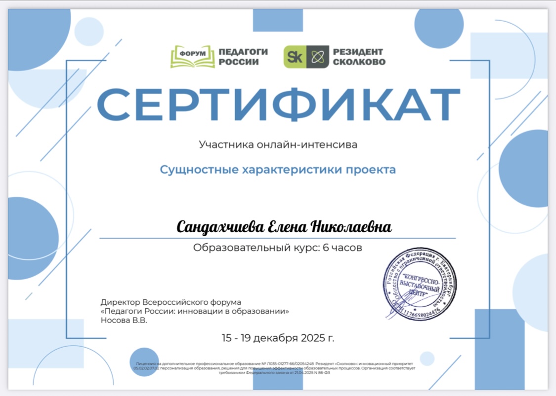 Сертификат участника онлайн интенсива "Сущностные характеристики проекта". 15-19 декабря 2025