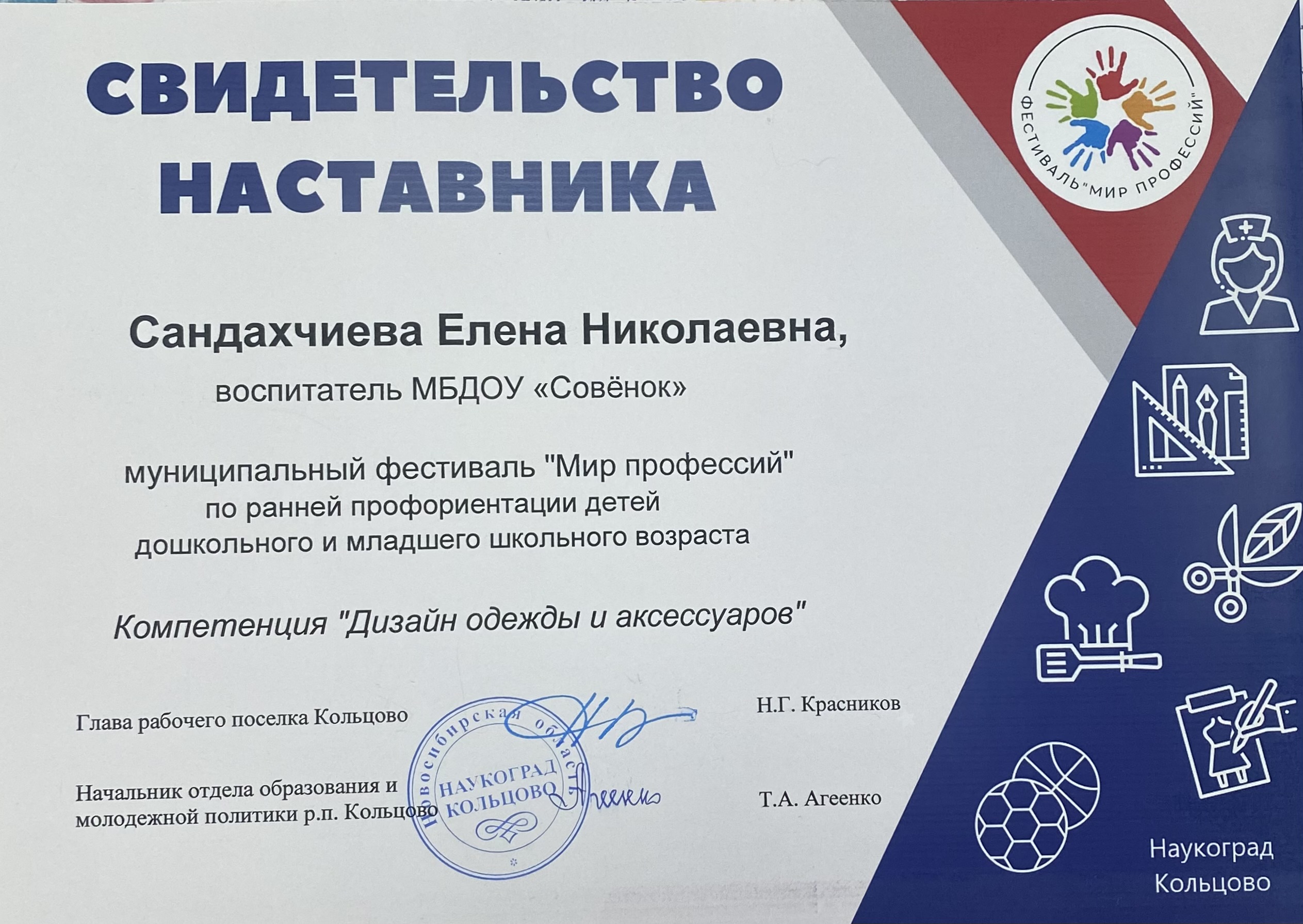 Свидетельство наставника Муниципальный фестиваль "Мир профессий" по ранней профориентации детей дошкольного возраста Компетенция "Дизайн одежды и аксессуаров" Январь 2026г